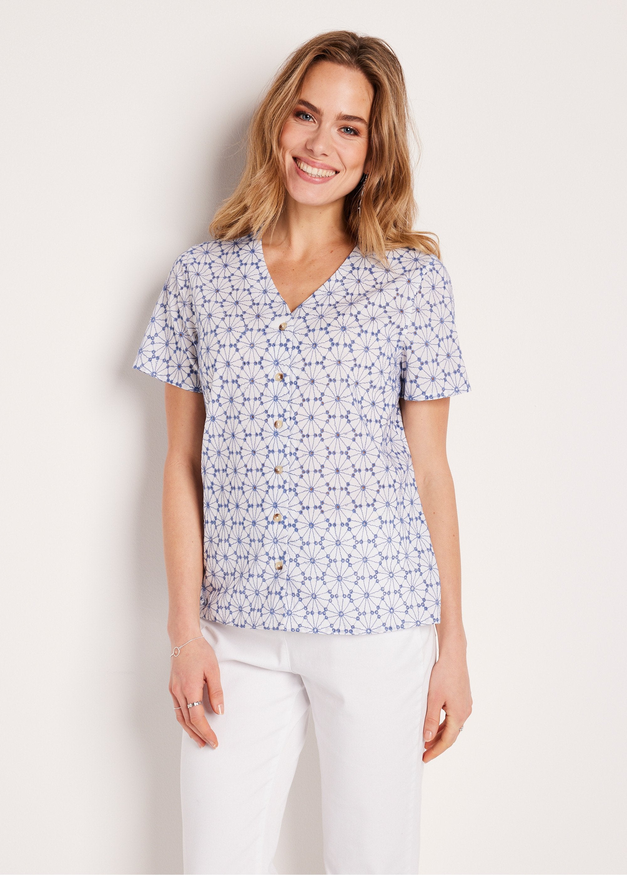 Cut from a comfortable fabric to wear, the blouse provides a total embroidered look. A style highlighted by a clean cut: V-neck, front button placket, short sleeves and straight hem.