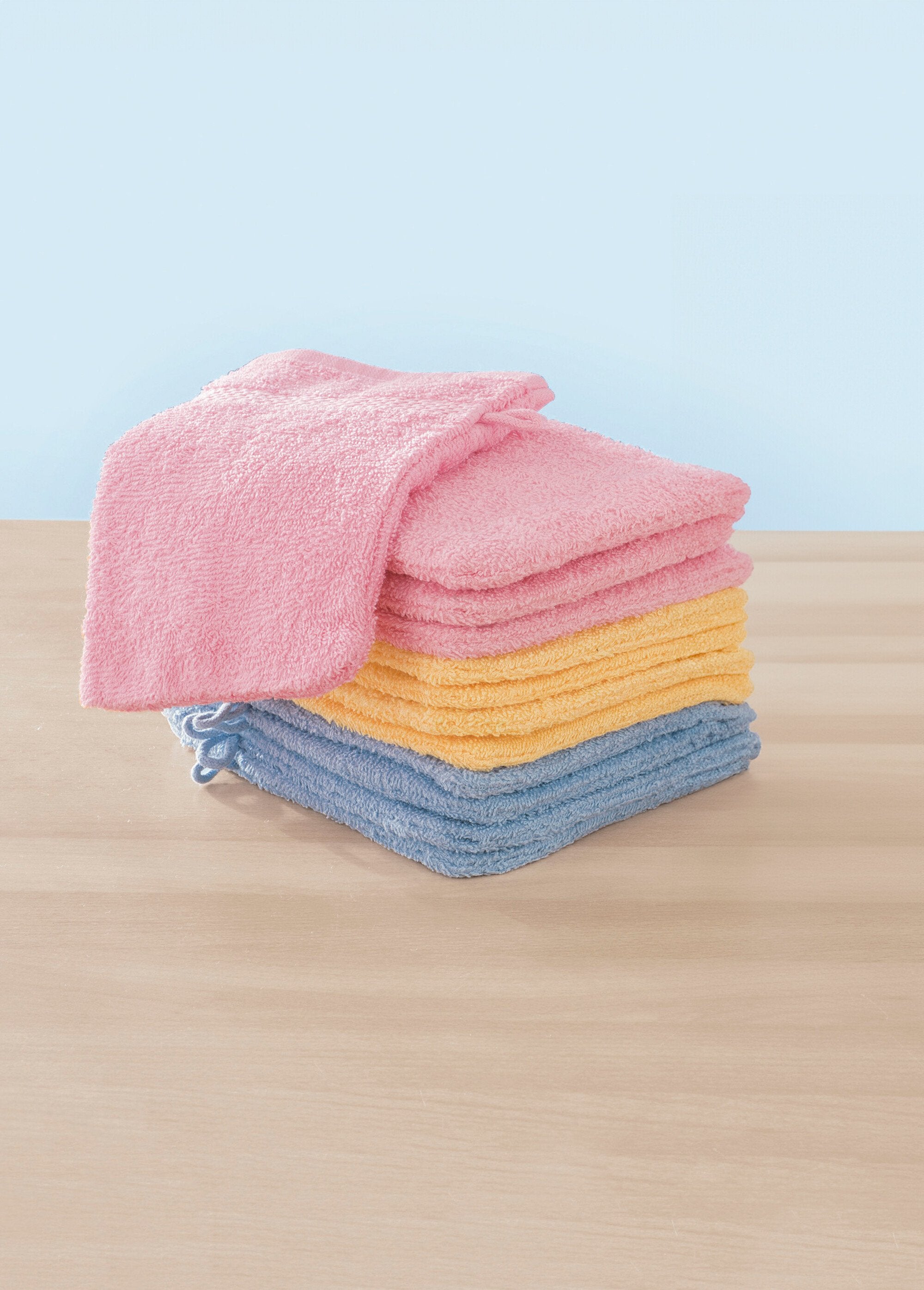 Plain or jacquard, this set of 12 gloves in assorted colors is perfect for completing or renewing your range of sponges. Hanging cord for plains. Dim. 15 x 21 cm approx. Washable 60°C. Pure cotton (360 g/m²). This product is certified OEKO-TEX® STANDARD 100 by OEKO-TEX® (No. 1604019 CENTEXBEL)