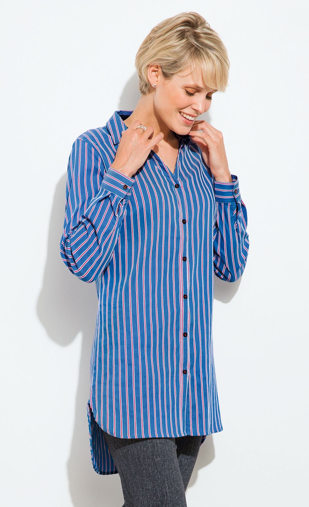 Long and beautifully striped, the tunic remains an undeniable asset in terms of style and comfort. Pointed collar, small V-neckline on button placket. Long sleeves with buttoned bracelet. Rounded hem with longer back and side slits. Topstitched finishes. Length. 84 cm approx. Washable. Fabric 70% cotton, 26% polyamide, 4% elastane.