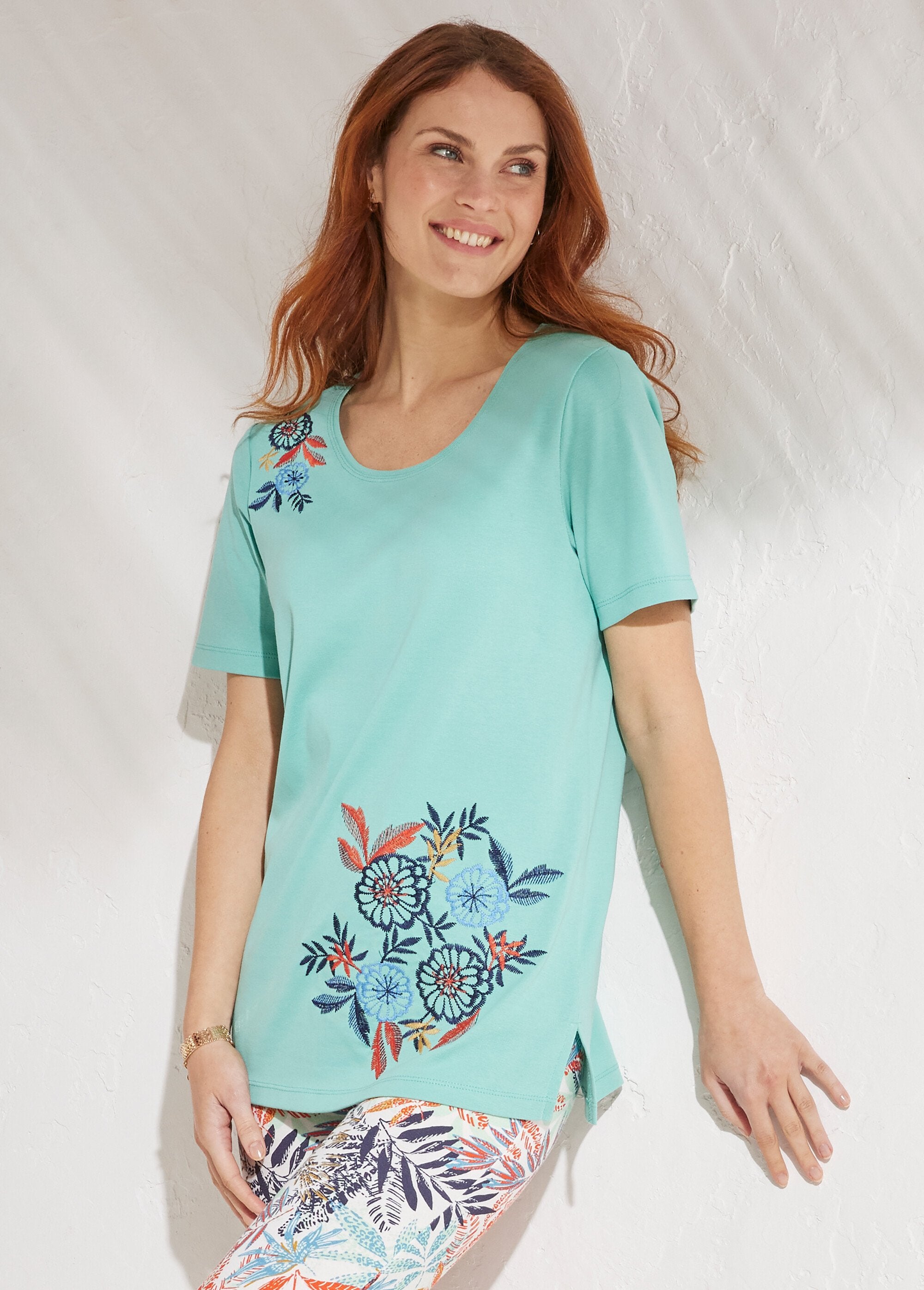 Plain with front embroidery or fully printed... A comfortable shape and 2 materials for this T-shirt, available in 2 pretty versions. Bias at round neckline. Double stitching at bottom of short sleeves and slit at sides.