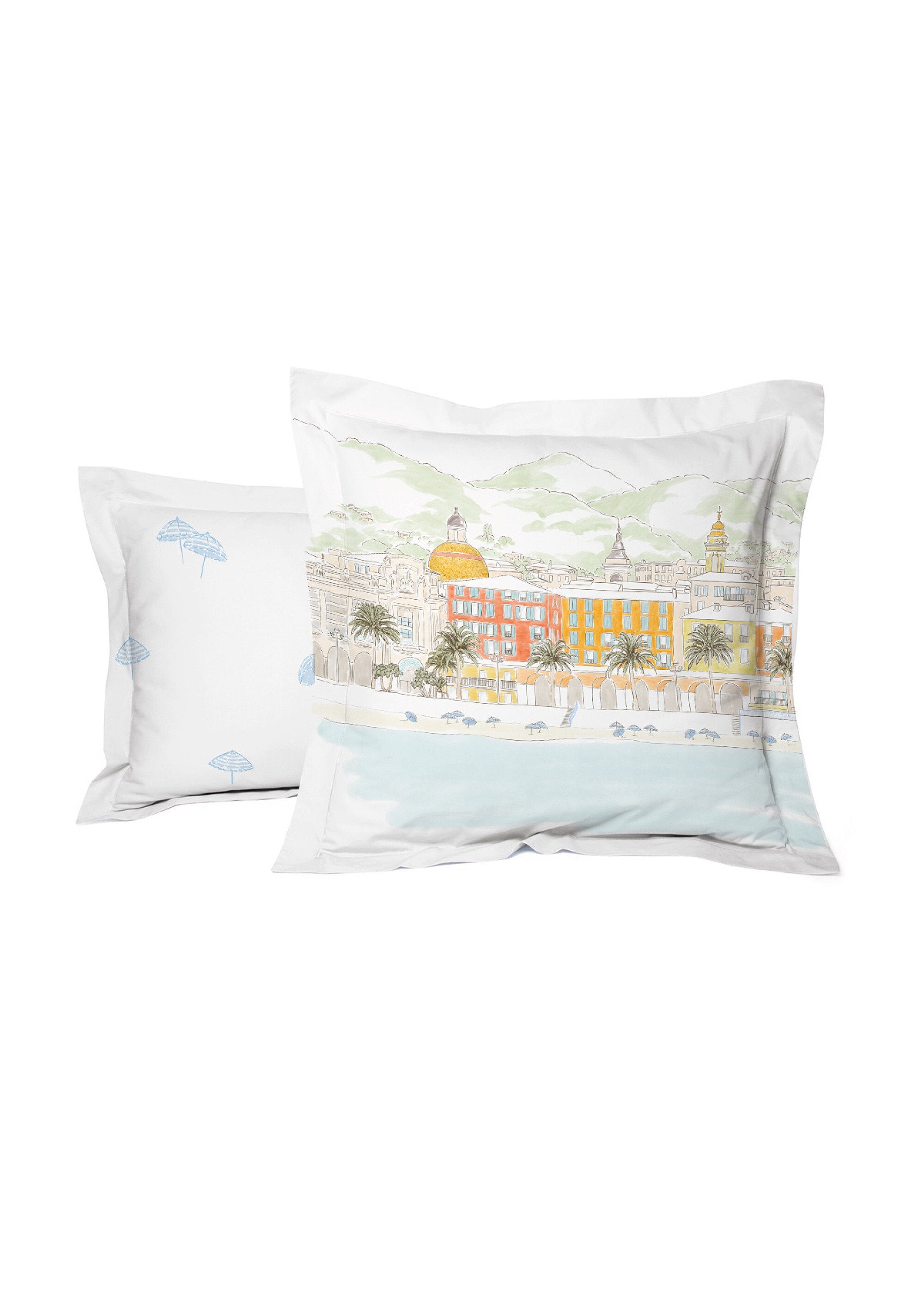With Tradition des Vosges®, transform your bedroom into a true haven of peace with the Nice bed set in 120 thread count cotton percale... a true ode to the beauty and charm of this iconic city! Each piece of this bed set is adorned with magnificent details capturing the essence of Nice. The colorful watercolor of the famous Promenade des Anglais adds an artistic and lively touch to your bedroom. You will admire its symbolic details such as the dome or the Saint-François tower, bringing a touch of elegance and heritage to your bed. The beauty of the palm trees and colorful facades will give you a feeling of eternal vacation. Finally, dream of sunny days by the sea with detailed illustrations of the beach and the iconic parasols of the Côte d'Azur.