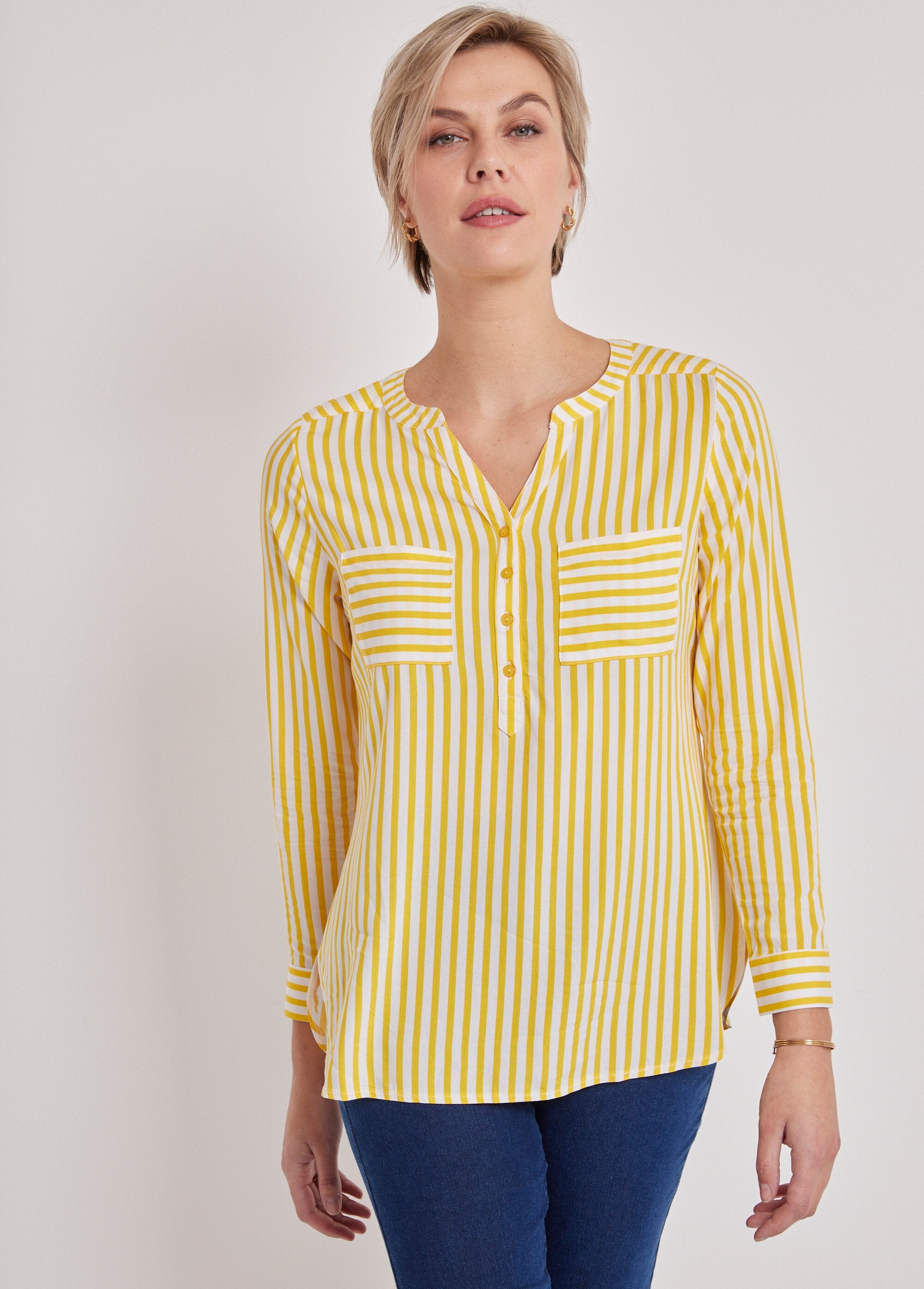 The tunic nicely combines vertical and horizontal stripes. Yoke attached to the rounded, open V-shaped neckline at the front. Small button placket. 2 patch chest pockets. Shoulder cutouts. Box pleat under middle back yoke. Long sleeves, buttoned cuffs. Rounded base with split sides.